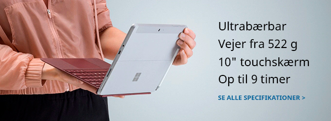 Den nye Surface Go er perfekt til alle dine daglige opgaver. Du får ydeevne som en bærbar computer, mobilitet som en tablet og en fantastisk touchskærm med alle kræfterne i Windows 10 Pro.